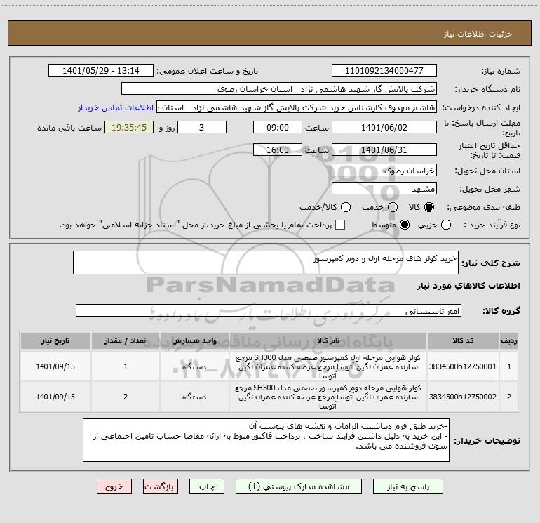 شرح کلی نیاز: خرید کولر های مرحله اول و دوم کمپرسور