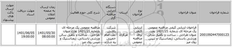 مناقصه، فراخوان ارزیابی کیفی مناقصه عمومی یک مرحله ای شماره 1401/21 تحت عنوان طراحی ، ساخت و تکمیل سالن ورزشی باستانی، ژیمناستیک و تنیس روی میز, مناقصه، فراخوان ارزیابی کیفی مناقصه عمومی یک مرحله ای شماره 1401/21 تحت عنوان طراحی ، ساخت و تکمیل سالن ورزشی باستانی، ژیمناستیک و تنیس روی میز