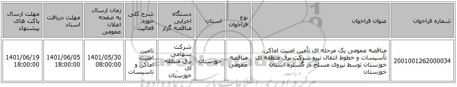 مناقصه، مناقصه عمومی یک مرحله ای تأمین امنیت اماکن، تأسیسات و خطوط انتقال نیرو شرکت برق منطقه ای خوزستان توسط نیروی مسلح در گستره استان خوزستان, مناقصه، مناقصه عمومی یک مرحله ای تأمین امنیت اماکن، تأسیسات و خطوط انتقال نیرو شرکت برق منطقه ای خوزستان توسط نیروی مسلح در گستره استان خوزستان