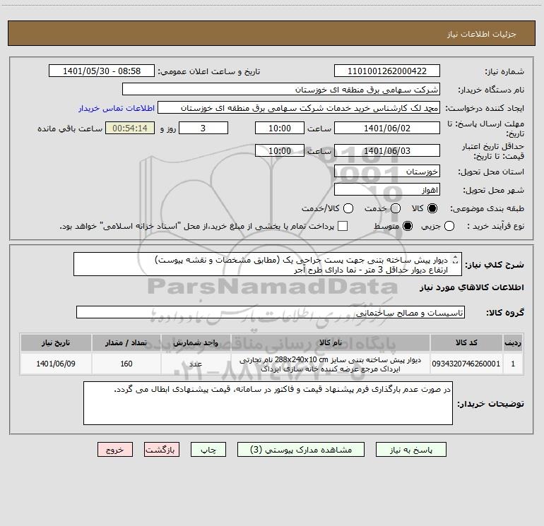 شرح کلی نیاز: دیوار پیش ساخته بتنی جهت پست جراحی یک (مطابق مشخصات و نقشه پیوست) ارتفاع دیوار حداقل 3 متر - نما دارای طرح آجر