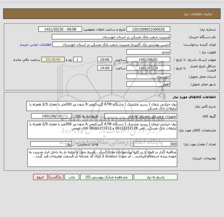 مشخصات کالای مورد نیاز: رول حرارتی ترمال ( رسید مشتری ) دستگاه ATM گریدکیفی A بدون پرز 300متر با مغزی 2/5 همراه با تبلیغات بانک مسکن. تلفن 06132232128 و 09161111012 آقای لویمی