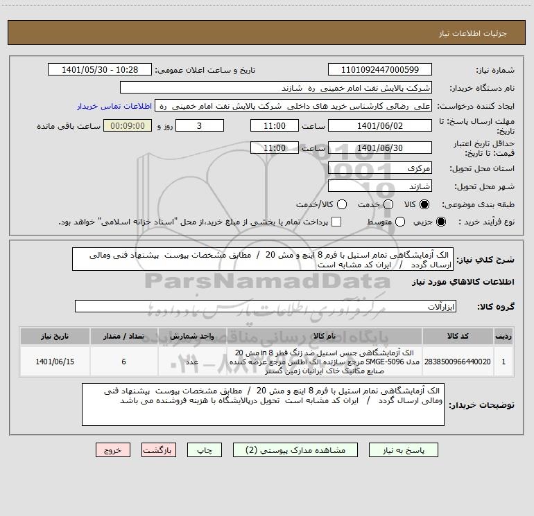 توضیحات خریدار: الک آزمایشگاهی تمام استیل با فرم 8 اینچ و مش 20 / مطابق مشخصات پیوست پیشنهاد فنی ومالی ارسال گردد / ایران کد مشابه است تحویل درپالایشگاه با هزینه فروشنده می باشد