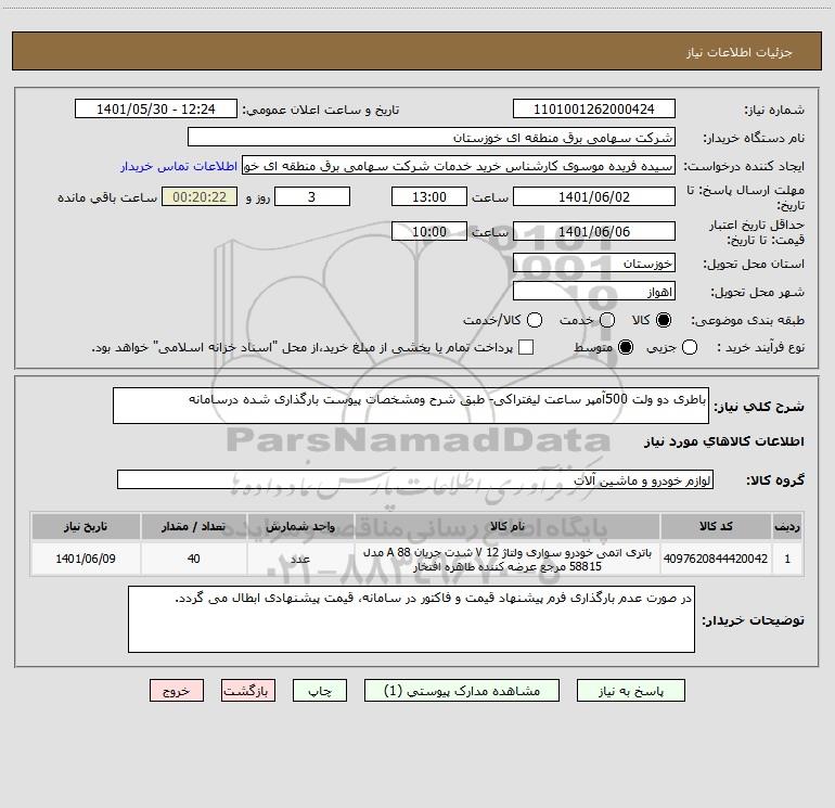 شرح کلی نیاز: باطری دو ولت 500آمپر ساعت لیفتراکی- طبق شرح ومشخصات پیوست بارگذاری شده درسامانه