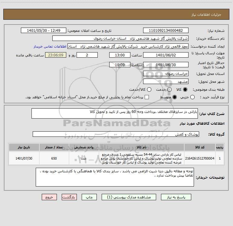 شرح کلی نیاز: بارانی در سایزهای مختلف .پرداخت وجه 60 روز پس از تایید و تحویل کالا
