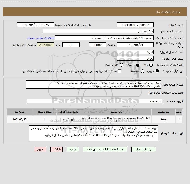 شرح کلی نیاز: تهیه، ساخت، حمل و نصب پارتیشن تمام شیشه سکوریت ، و... (طبق قرارداد پیوست)