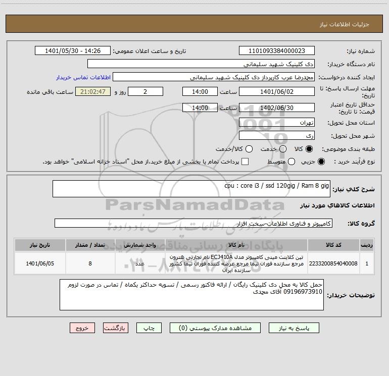 شرح کلی نیاز: cpu : core i3 / ssd 120gig / Ram 8 gig