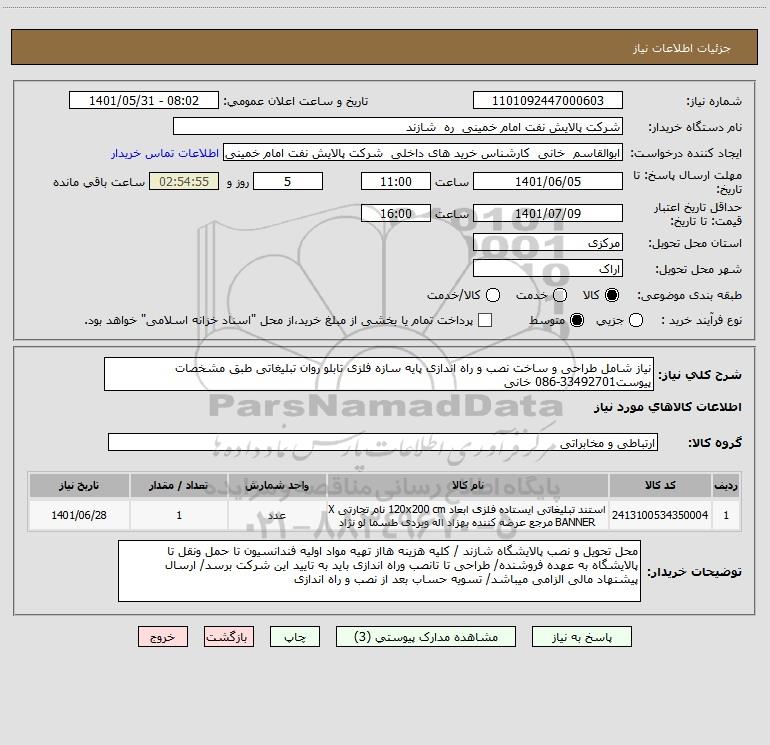 شرح کلی نیاز: نیاز شامل طراحی و ساخت نصب و راه اندازی پایه سازه فلزی تابلو روان تبلیغاتی طبق مشخصات پیوست33492701-086 خانی