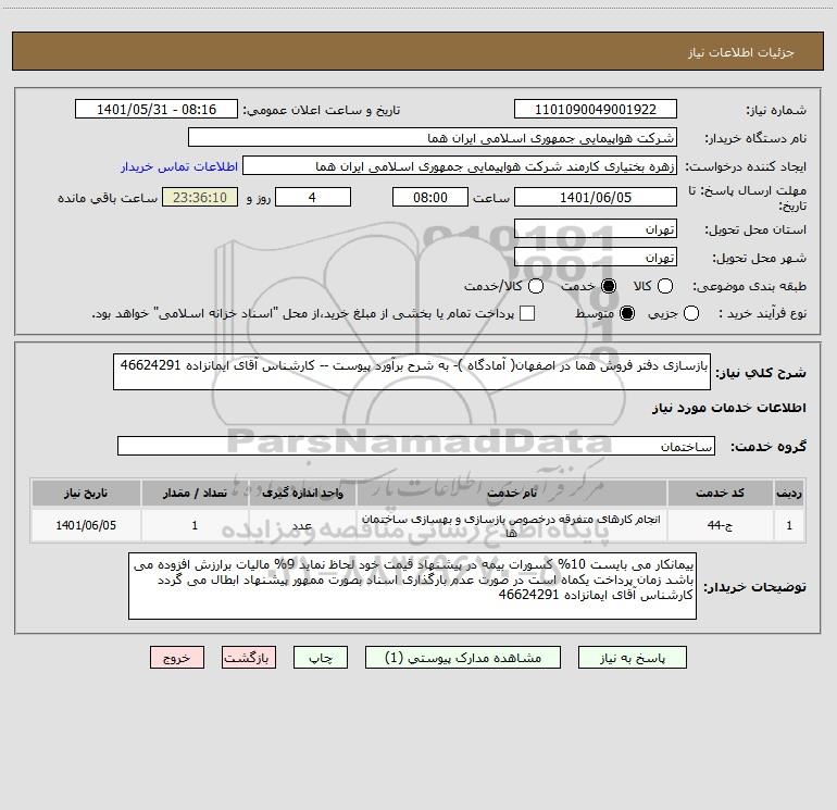 شرح کلی نیاز: بازسازی دفتر فروش هما در اصفهان( آمادگاه )- به شرح برآورد پیوست -- کارشناس آقای ایمانزاده 46624291