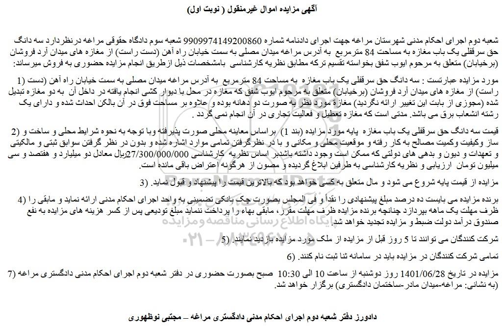 شعبه دوم اجرای احکام مدنی شهرستان مراغه جهت اجرای دادنامه شماره 9909974149200860 شعبه سوم دادگاه حقوقی مراغه درنظردارد سه دانگ حق سرقفلی یک باب مغازه به مساحت 84 مترمربع به آدرس مراغه میدان مصلی به سمت خیابان راه آهن (دست راست) از مغازه های میدان آرد فروشان (برخیابان) متعلق به مرحوم ایوب شفق بخواسته تقسیم ترکه مطابق نظریه کارشناسی بامشخصات ذیل ازطریق انجام مزایده حضوری به فروش میرساند: