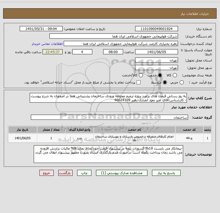 شرح کلی نیاز: به روز رسانی قیمت های برآورد پروژه ترمیم محوطه ورودی ساختمان پشتیبانی هما در اصفهان به شرح پیوست - کارشناس:آقای امیر محمد انصاری رهبر 46624109