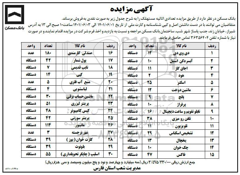 بانک مسکن در نظر دارد از طریق مزایده تعدادی اثاثیه مستهلک را به شرح ذیل به صورت نقدی به فروش برساند. متقاضیان می توانند با در دست داشتن اصل و کپی شناسنامه و کارت ملی از تاریخ 1401.6.1 الی 1401.6.3 ساعت 10 صبح الی 13 به آدرس شیراز - خیابان زند - جنب پاساژ شهر شب ساختمان بانک مسکن مراجعه و نسبت به بازدید و اخذ فرم شرکت در مزایده اقدام نمایند و در صورت نیاز با شماره تلفن 36356404 تماس حاصل فرمایند.