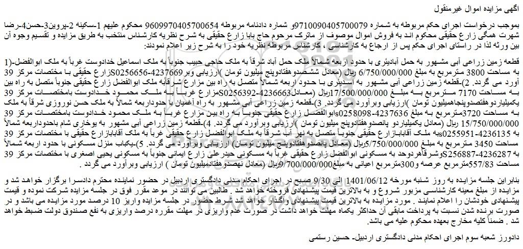 مزایده فروش قطعه زمین زراعی آبی مشهور به حمل آبادیئری, مزایده فروش قطعه زمین زراعی آبی مشهور به حمل آبادیئری