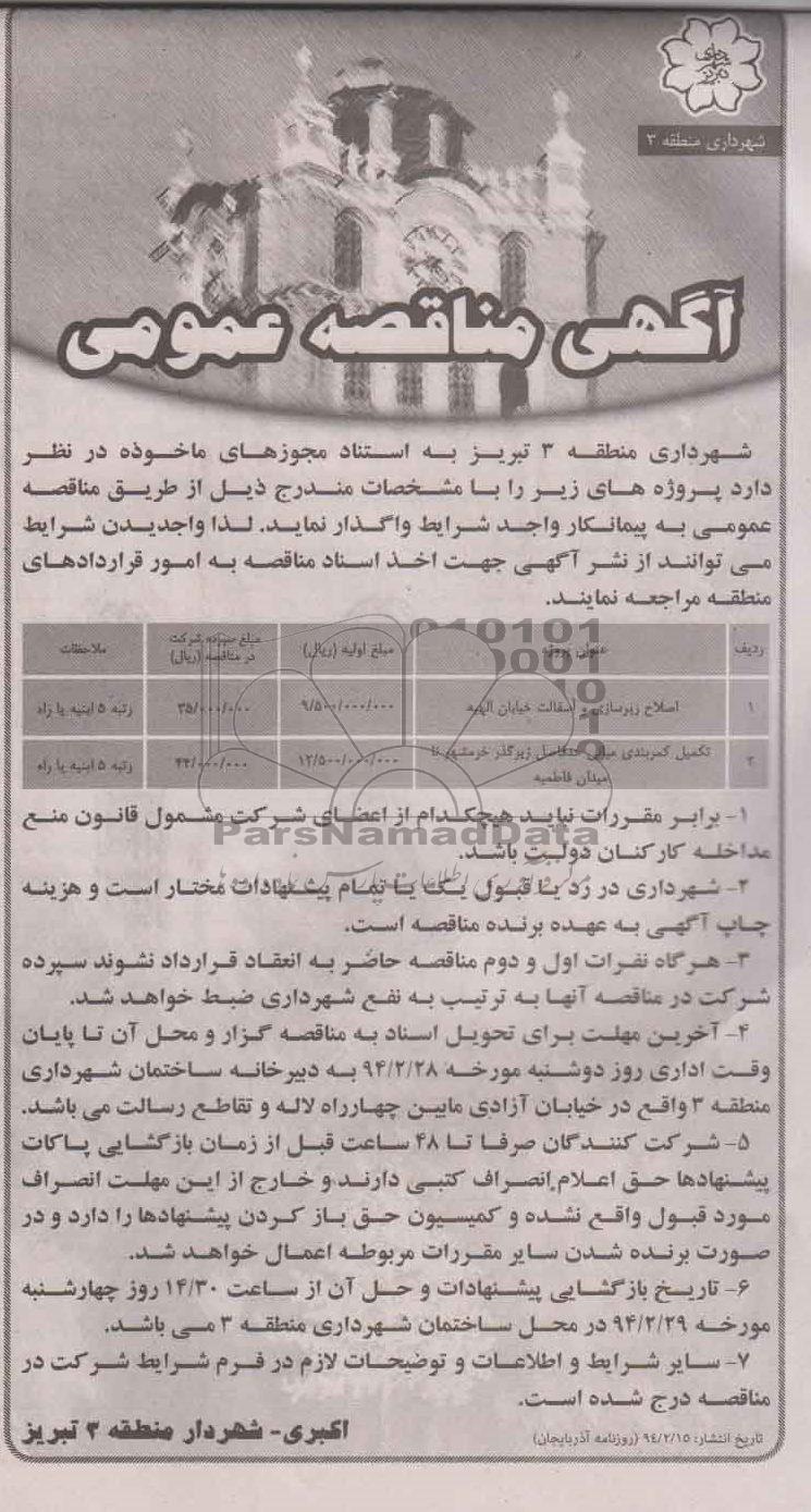 شهرداری منطقه 3 تبریز به استناد مجوزهای ماخوذه در نظر دارد پروژه های زیر را با مشخصات مندرج ذیل از طریق مناقصه عمومی به پیمانکار واجد شرایط واگذار نماید. لذا واجدین شرایط می توانند از نشر آگهی جهت اخذ اسناد مناقصه به امور قراردادهای منطقه مراجعه نمایند.