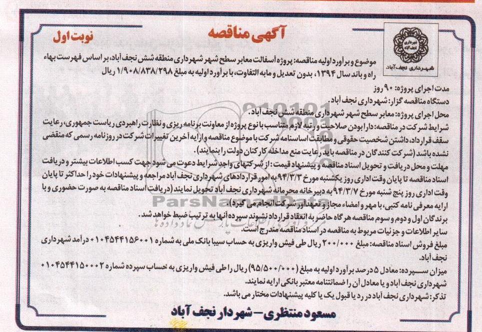 موضوع و برآورد اولیه مناقصه: پروژه آسفالت معابر سطح شهر شهرداری منطقه شش نجف آباد بر اساس فهرست بها راه و باند سال 94 بدون تعدیل و مابه التفاوت با برآورد اولیه به مبلغ 1.908.838.298 ریال