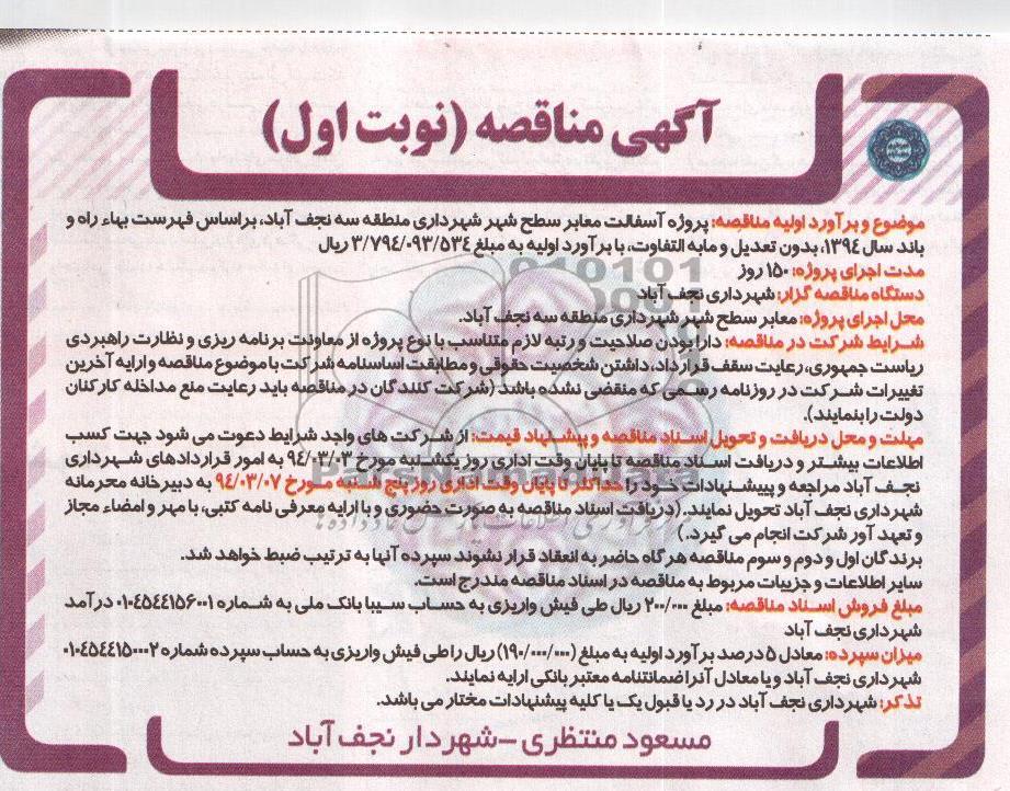 موضوع و برآورد اولیه مناقصه: پروژه آسفالت معابر سطح شهر شهرداری منطقه سه نجف آباد ، بر اساس فهرست بهاء راه و باند سال 1394 ، بدون تعدیل و مابه التفاوت ، با برآورد اولیه به مبلغ 3.794.093.534 ریال