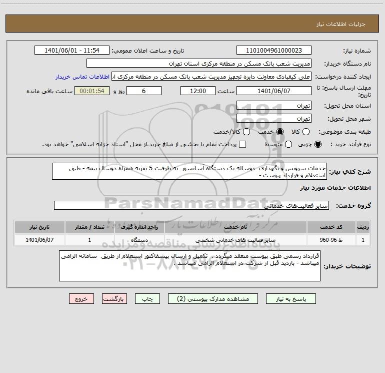 شرح کلی نیاز: خدمات سرویس و نگهداری دوساله یک دستگاه آسانسور به طرفیت 5 نفربه همراه دوسال بیمه - طبق استعلام و قرارداد پیوست -