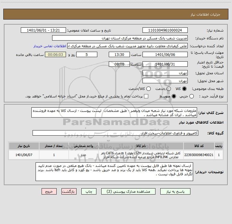شرح کلی نیاز: ملزومات شبکه مورد نیاز شعبه میدان ولیعصر - طبق مشخصات لیست پیوست - ارسال کالا به عهده فروشنده میباشد . ایران کد مشابه میباشد .