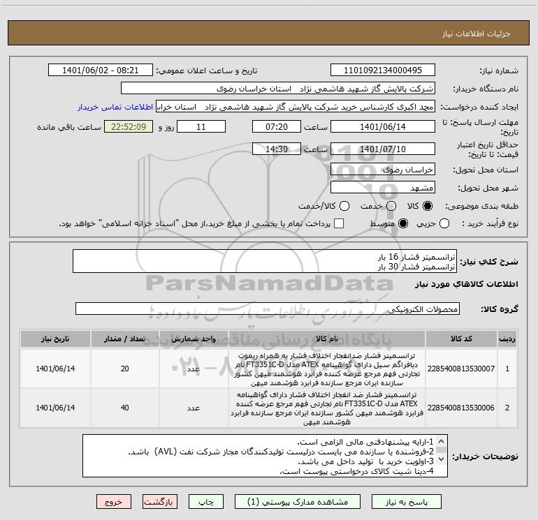 نام دستگاه خریدار:شرکت پالایش گاز شهید هاشمی نژاد استان خراسان رضوی