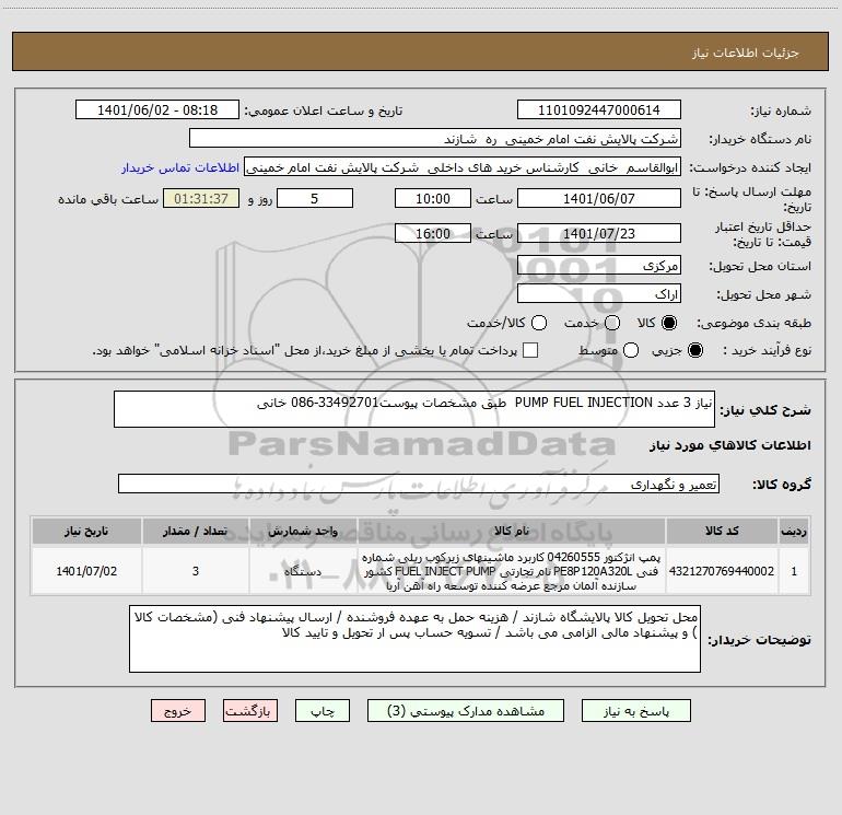 شرح کلی نیاز: نیاز 3 عدد PUMP FUEL INJECTION طبق مشخصات پیوست33492701-086 خانی