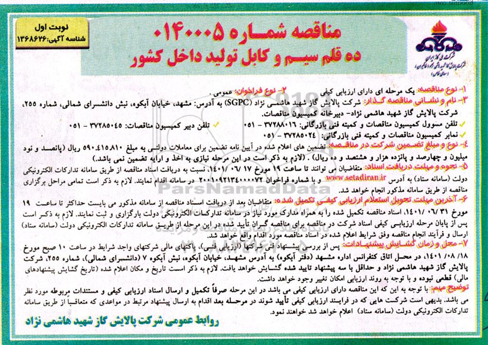 مناقصه ده قلم سیم و کابل از کلیه افراد متخصص و شرکتها واجد شرایط دعوت به عمل میآید در مناقصه با کد خبرگزاری پارس نماد: 4858028 شرکت نمایند.
