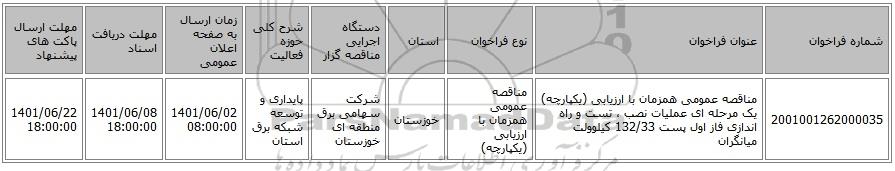 مناقصه، مناقصه عمومی همزمان با ارزیابی (یکپارچه) یک مرحله ای عملیات نصب ، تست و راه اندازی فاز اول پست 132/33 کیلوولت میانگران, مناقصه، مناقصه عمومی همزمان با ارزیابی (یکپارچه) یک مرحله ای عملیات نصب ، تست و راه اندازی فاز اول پست 132/33 کیلوولت میانگران