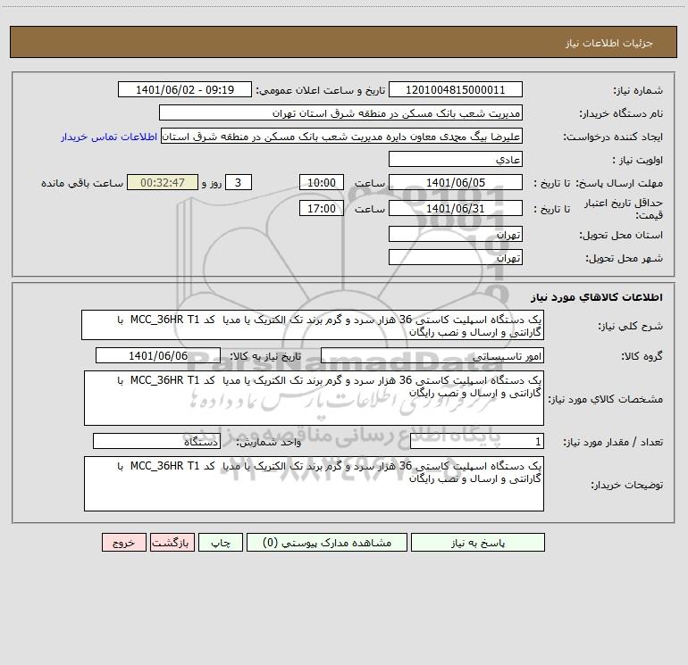 نام دستگاه خریدار:مدیریت شعب بانک مسکن در منطقه شرق استان تهران