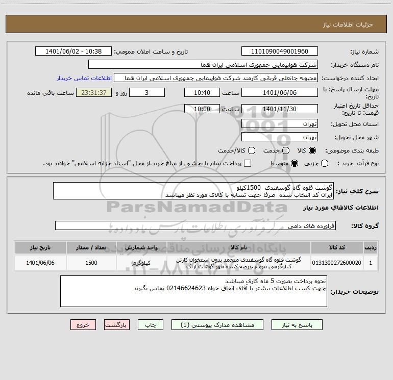 | 1 | 0131300272600020 | گوشت قلوه گاه گوسفندی منجمد بدون استخوان کارتن کیلوگرمی مرجع عرضه کننده مهر گوشت اراک | کیلوگرم | 1500 | 1401/06/06 |