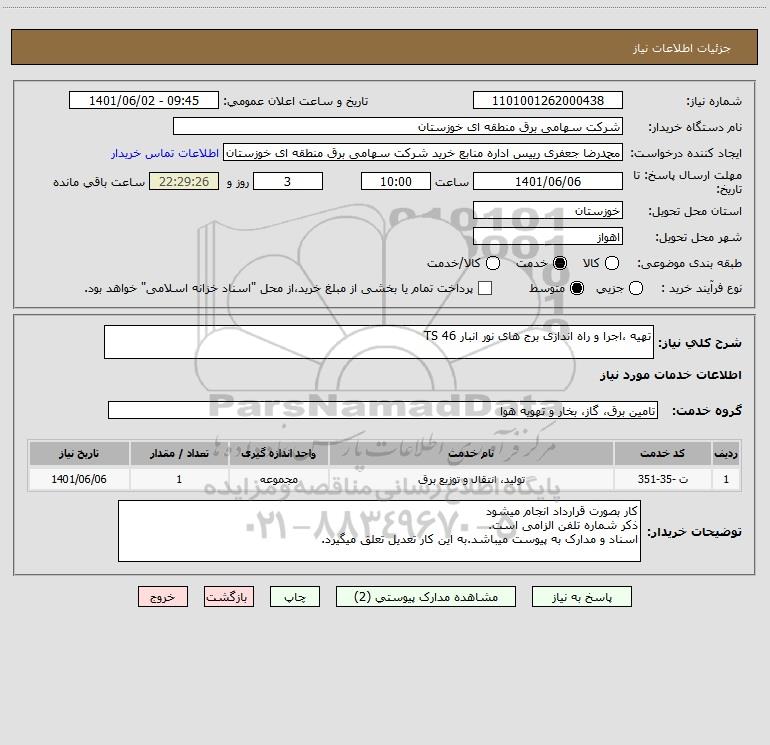 شرح کلی نیاز: تهیه ،اجرا و راه اندازی برج های نور انبار TS 46
