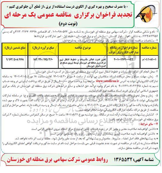 تجدید مناقصه تامین امنیت اماکن تاسیسات و خطوط انتقال نیرو - نوبت دوم , تجدید مناقصه تامین امنیت اماکن تاسیسات و خطوط انتقال نیرو - نوبت دوم