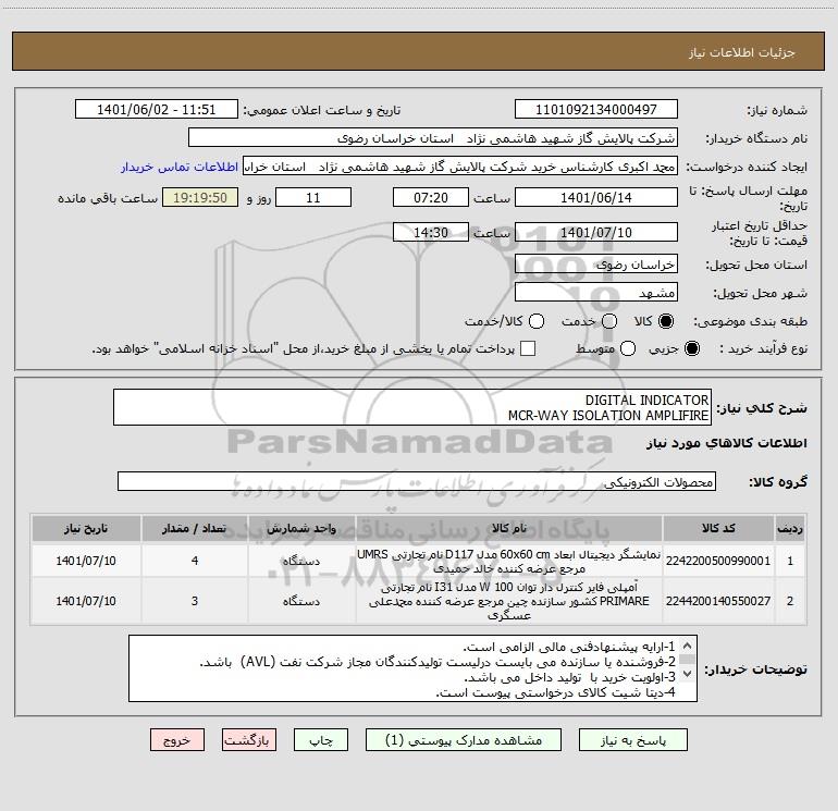 نام دستگاه خریدار:شرکت پالایش گاز شهید هاشمی نژاد استان خراسان رضوی