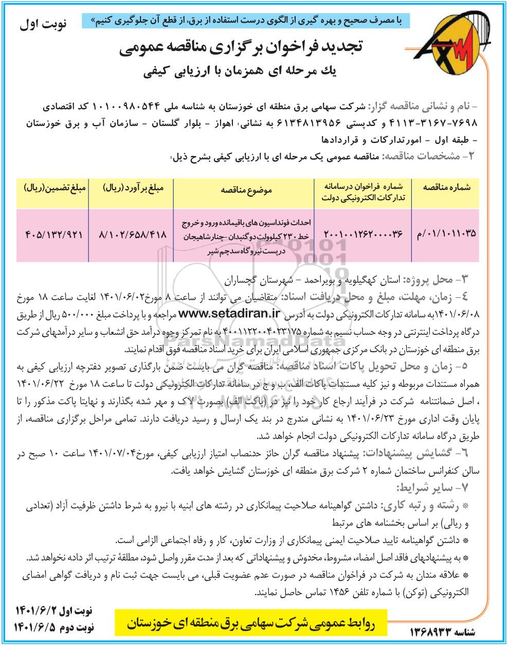 | 1011035/ 01/ م | 2001001262000036 | احداث فونداسیون های باقیمانده ورود و خروج خط 230 کیلوولت دوگنبدان - چنار شاهیجان در پست نیروگاه سد چم شیر | 8.102.658.418 | 405.132.921 |