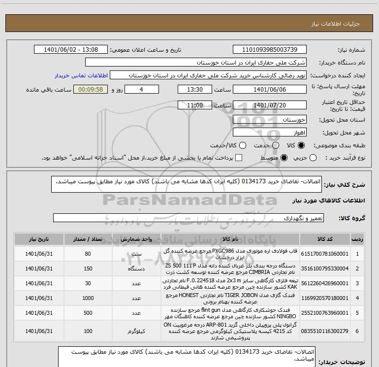 شرح کلی نیاز: اتصالات- تقاضای خرید 0134173 (کلیه ایران کدها مشابه می باشند) کالای مورد نیاز مطابق پیوست میباشد.
