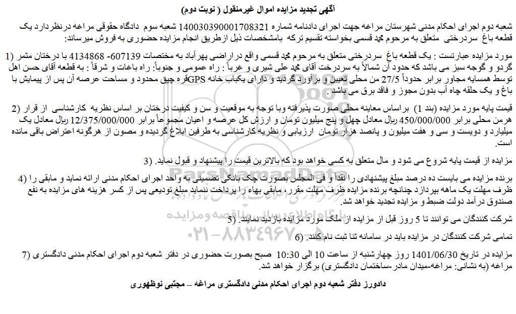 شعبه دوم اجرای احکام مدنی شهرستان مراغه جهت اجرای دادنامه شماره 140030390001708321 شعبه سوم دادگاه حقوقی مراغه درنظردارد یک قطعه باغ سردرختی متعلق به مرحوم محمد قسمی بخواسته تقسیم ترکه بامشخصات ذیل ازطریق انجام مزایده حضوری به فروش میرساند: