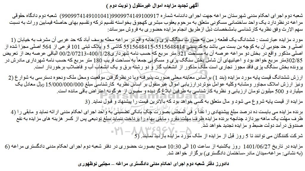 شعبه دوم اجرای احکام مدنی شهرستان مراغه جهت اجرای دادنامه شماره 9909974149100917(9909974149101041)  شعبه دوم دادگاه حقوقی مراغه درنظردارد یک واحد ساختمانی مسکونی متعلق به مرحوم یعقوب مبشری کهجوق بخواسته تقسیم ترکه وتقسیم بهای حاصله فیمابین وراث به نسبت سهم الارث وفق نظریه کارشناسی بامشخصات ذیل ازطریق انجام مزایده حضوری به فروش میرساند: