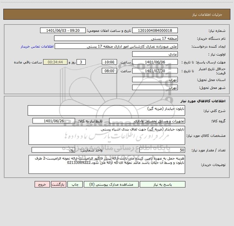 مشخصات کالای مورد نیاز: نایلون حبابدار (ضربه گیر) جهت لفاف بندی اشیاء پستی