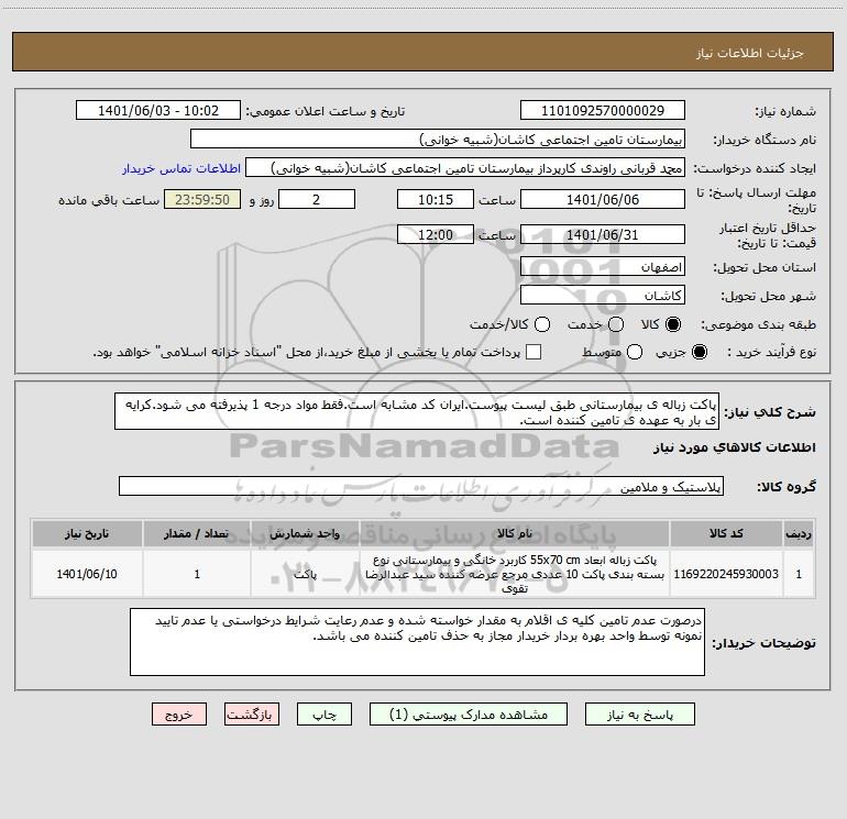 شرح کلی نیاز: پاکت زباله ی بیمارستانی طبق لیست پیوست.ایران کد مشابه است.فقط مواد درجه 1 پذیرفته می شود.کرایه ی بار به عهده ی تامین کننده است.