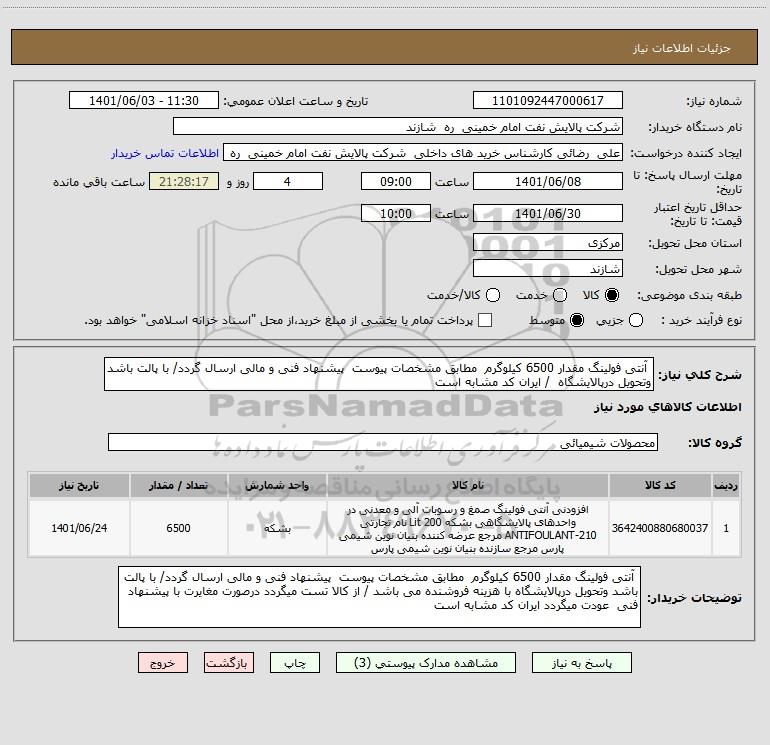 شرح کلی نیاز: آنتی فولینگ مقدار 6500 کیلوگرم مطابق مشخصات پیوست پیشنهاد فنی و مالی ارسال گردد/ با پالت باشد وتحویل درپالایشگاه / ایران کد مشابه است