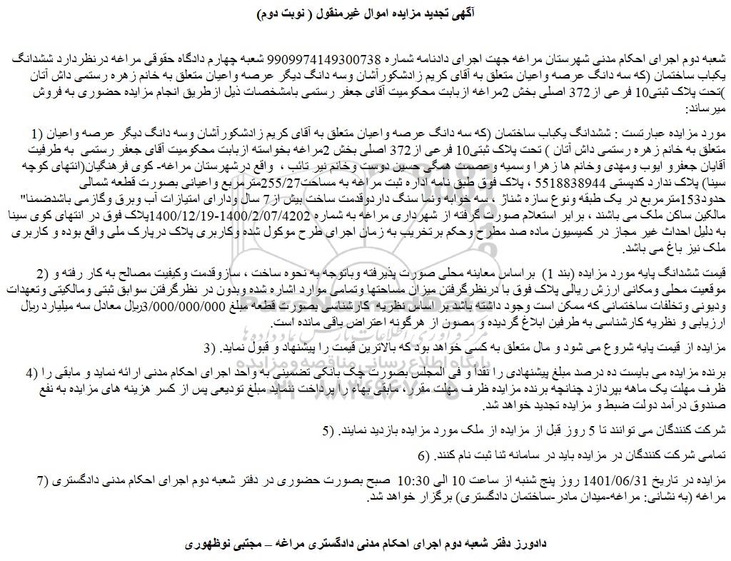 شعبه دوم اجرای احکام مدنی شهرستان مراغه جهت اجرای دادنامه شماره 9909974149300738 شعبه چهارم دادگاه حقوقی مراغه درنظردارد ششدانگ یکباب ساختمان (که سه دانگ عرصه واعیان متعلق به آقای کریم زادشکورآشان وسه دانگ دیگر عرصه واعیان متعلق به خانم زهره رستمی داش آتان )تحت پلاک ثبتی10 فرعی از372 اصلی بخش 2مراغه ازبابت محکومیت آقای جعفر رستمی بامشخصات ذیل ازطریق انجام مزایده حضوری به فروش میرساند:
