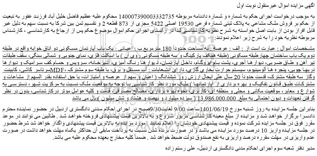 به موجب درخواست اجرای حکم به شماره و شماره دادنامه مربوطه 140007390003332735 محکوم علیه عظیم فاضل خلیل آباد فرزند غفور به تبعیت از حکم بر فروش ملک مشاعی به پلاک ثبتی شماره فرعی 19530 اصلی 5422 مجزی از 873 قطعه 2 و تقسیم ثمن بین شرکا به نسبت سهم به دلیل غیر قابل افراز بودن از بابت اصل خواسته به شرح نظریه کارشناسی لذا در راستای اجرای حکم اموال موضوع حکم پس از ارجاع به کارشناسی ، کارشناس مربوطه نظریه خود را به شرح زیر اعلام نمودند: