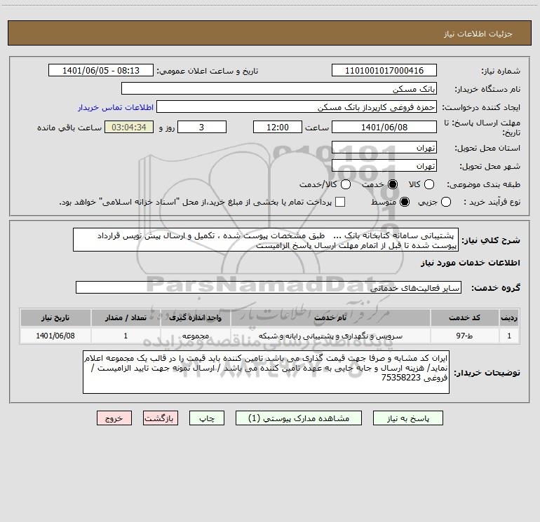 شرح کلی نیاز: پشتیبانی سامانه کتابخانه بانک ... طبق مشخصات پیوست شده ، تکمیل و ارسال پیش نویس قرارداد پیوست شده تا قبل از اتمام مهلت ارسال پاسخ الزامیست