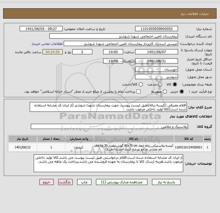 استعلام اقلام مصرفی (کیسه زباله)طبق لیست پیوست جهت بیمارستان شهدا شوشتر (از ایران کد مشابه استفاده شده است)کالا تولید داخلی مرغوب باشد., استعلام اقلام مصرفی (کیسه زباله)طبق لیست پیوست جهت بیمارستان شهدا شوشتر (از ایران کد مشابه استفاده شده است)کالا تولید داخلی مرغوب باشد.