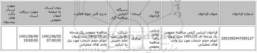 | 2001092447000127 | فراخوان ارزیابی کیفی مناقصه عمومی یک مرحله ای 1401/25 تحت عنوان انچام حجم خدمات مورد نیاز واحد های عملیاتی | ارزیابی کیفی برای مناقصه عمومی | مرکزی | شرکت پالایش نفت امام خمینی ره شازند | مناقصه عمومی یک مرحله ای 1401/25 تحت عنوان انچام حجم خدمات مورد نیاز واحد های عملیاتی | 1401/06/05 07:00:00 | 1401/06/09 19:00:00 |