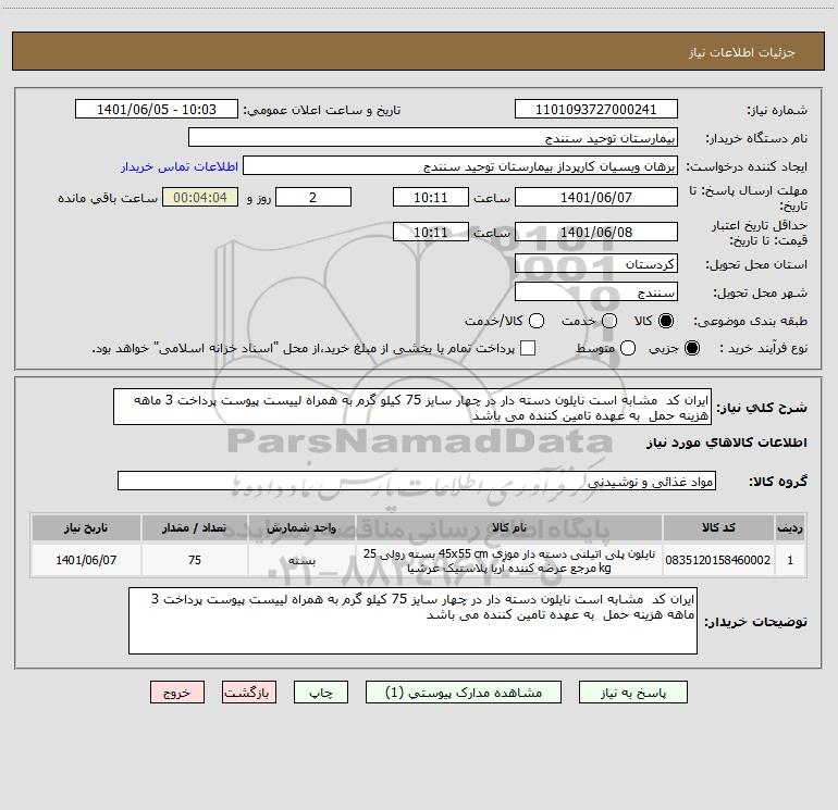 شرح کلی نیاز: ایران کد مشابه است نایلون دسته دار در چهار سایز 75 کیلو گرم به همراه لییست پیوست پرداخت 3 ماهه هزینه حمل به عهده تامین کننده می باشد