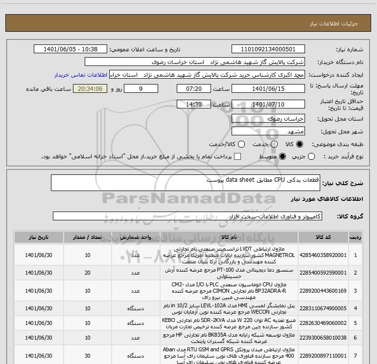 نام دستگاه خریدار:شرکت پالایش گاز شهید هاشمی نژاد استان خراسان رضوی