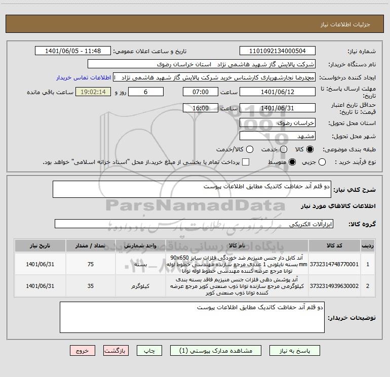 نام دستگاه خریدار:شرکت پالایش گاز شهید هاشمی نژاد استان خراسان رضوی