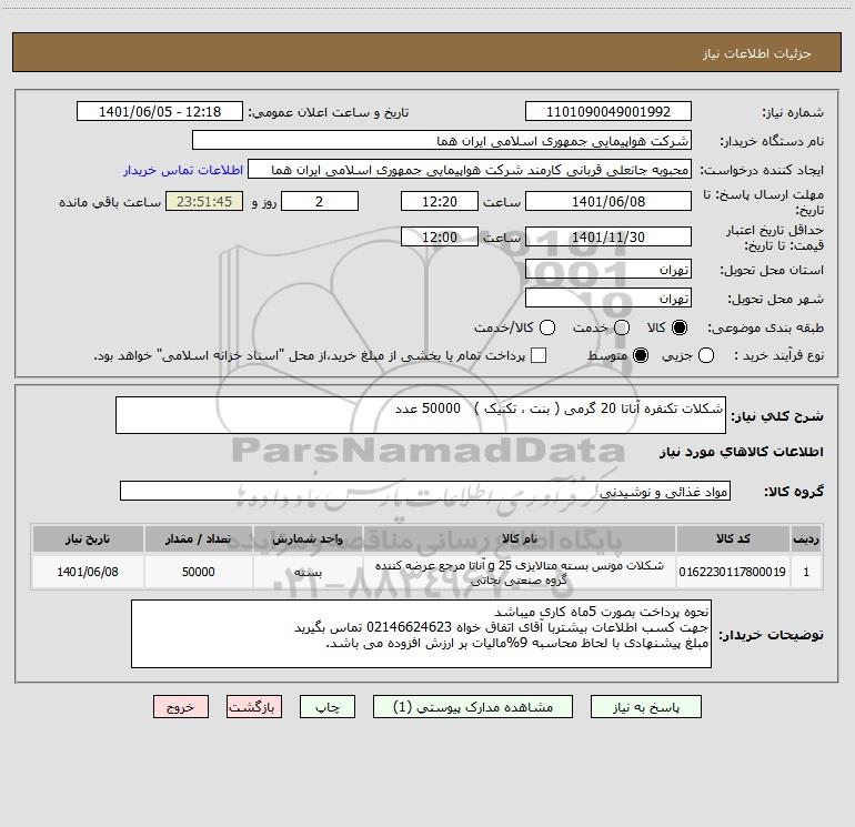 شرح کلی نیاز: شکلات تکنفره آناتا 20 گرمی ( بنت ، تکنیک ) 50000 عدد