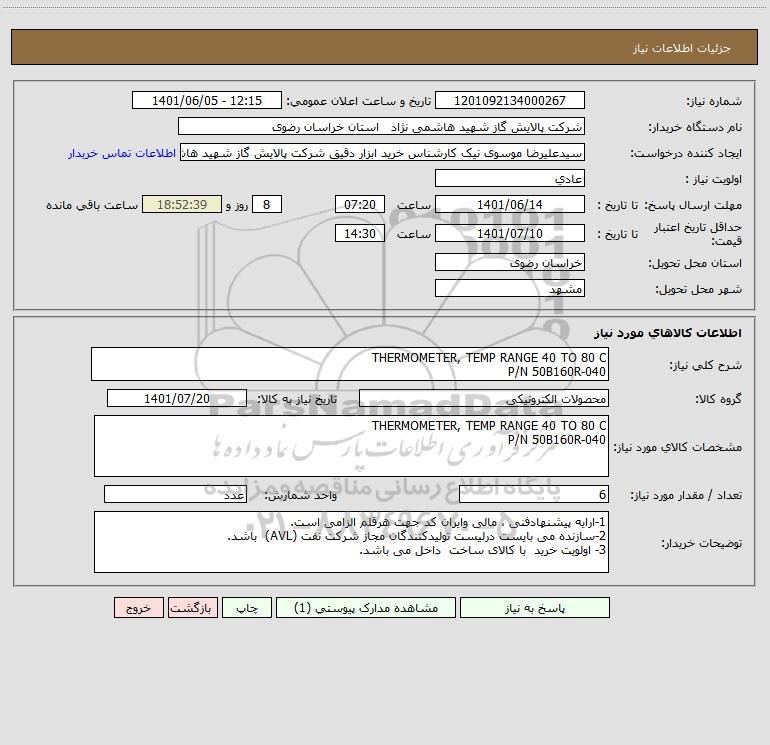 نام دستگاه خریدار:شرکت پالایش گاز شهید هاشمی نژاد استان خراسان رضوی