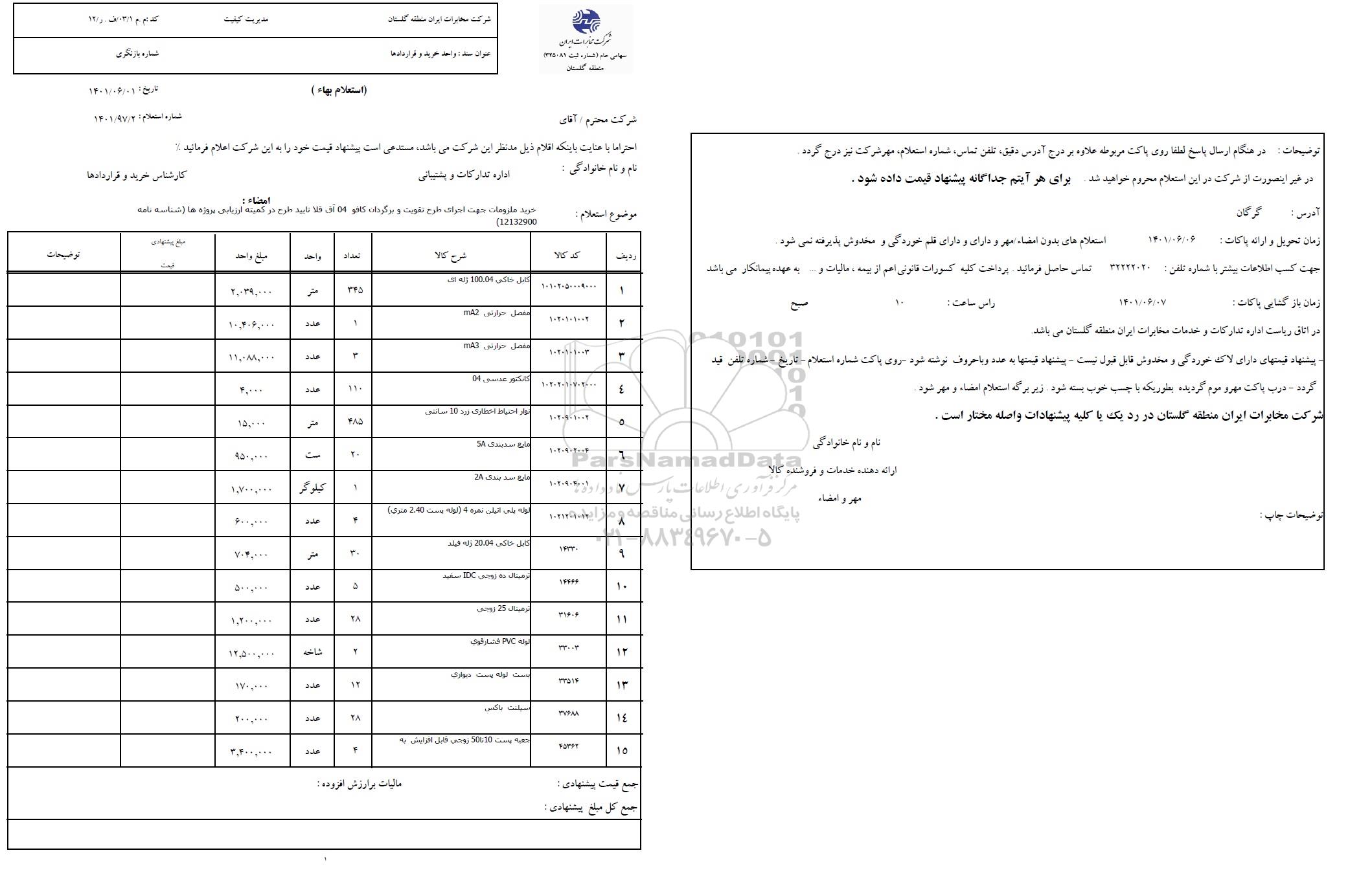 شرکت مخابرات ایران منطقه گلستان در رد یک یا کلیه پیشنهادات واصله مختار است