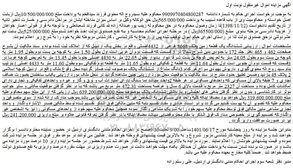 مشخصات اموال : ارزیابی ششدانگ یک قطعه زمین پلاک 8668 فرعی از 4432اصلی واقع در بخش یک اردبیل که از املاک ثبت شده بوده و سند مالکیت آن بشرح صفحات 462 و 465 دفتر جلد 172 با حدودی بدین شرح(شمالا در 3 قسمت که قسمت دوم آن غربی است اول بطول 1.50 متر به کوچه بن بست دوم بطول 1.95 متر به کوچه بن بست سوم بطول 24.05 متر به تعریض کوچه بن بست شرقا دیوار بدیوار بطول 22.65 متر به 4430 اصلی جنوبا بطول 13.45 متر به تعریض کوچه غربا در 3قسمت که قسمت دوم آن جنوبی است اول بطول 11.64 متر به قطعه 2 تفکیکی دوم بطول 11.65 متر به قطعه دوم تفکیکی سوم بطول 11.60 متر به 4433 اصلی ) بترتیب بنام سید روح اله معنوی گیوی و داریوش بهبودی سراج هر کدام 3دانگ مشاع از ششدانگ پلاک موصوف ثبت صادر گردیده محل وقوع ملک واقع در اردبیل کوچه اسلامی 2 پلاک 45 بازدید وضمن تطبیق حدود مندرج در سند مالکیت با موقعیت محل مورد ارزیابی چنین مشاهده گردید در محل ملک مورد ارزیابی یکباب ساختمان بصورت همکف تجاری و 7 طبقه بالای آن مسکونی که واحدهای مسکونی در هر طبقه 2واحد میباشد نما سنگ دارای امتیازات آب و برق و گاز و غیره و واحدهای تفکیکی و تجاری دارای امکانات کامل بوده و مساحت آن 2327 متر مربع با قدمت بالای 6 سال و عرصه بمساحت 472.31 متر مربع می باشد که با در نظر گرفتن موقعیت مکانی و سایر جوانب موثر در کارشناسی و بدون در نظر گرفتن بدهی های احتمالی و بازداشتی ششدانک پلاک موصوف بمبلغ 639.200.000.000 ریال ارزیابی که از این مبلغ سهم محکوم علیه مبلغ 319.600.000.000 ریال خواهد بود مضافا اینکه کلیه واحد های مسکونی به اشخاص غیر که تحت تصرف آنها می باشد.بموجب مدارک ارائه شده از سوی متصرفین و محکوم علیه که تصویر آن به پیوست تقدیم می گردد برابر اسناد عادی و مفاد تقسیم نامه که مابین مالکین فوق الذکر تقسیم شده توسط مالکین صدر الاشاره واگذار و واحد تجاری مشاعی مابین مالکین فوق توسط محکوم علیه سهم خود را به شریک مشاعی واگذار نموده همچنین محکوم علیه سهم خود از واحدهای مسکونی را نیز به اشخاص غیر واگذارکه تصمیم گیری در خصوص مدارک فوق الذکر با مقام محترم قضایی میباشد مضافا اینکه با در نظر گرفتن تعرفه قانونی علاوه بر مبلغ واریزی 241.200.000 ریال نیز در صورت موافقت واریز گردد .