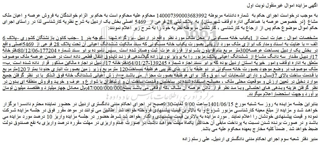 به موجب درخواست اجرای حکم به  شماره دادنامه مربوطه 140007390003683992 محکوم علیه محکوم است به حکم بر الزام خواندگان به فروش عرصه و اعیان ملک مشاع {در خصوص عرصه با هماهنگی اداره اوقاف شهرستان} به  پلاک ثبتی 28 فرعی از  5469 اصلی بخش یک اردبیل به شرح نظریه کارشناسی لذا در راستای اجرای حکم اموال موضوع حکم پس از ارجاع به کارشناسی ، کارشناس مربوطه نظریه خود را به شرح زیر اعلام نمودند: